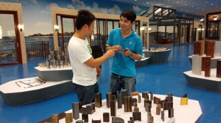 (我司銷售部人員在全國最大的門窗體驗(yàn)中心向貴賓介紹我司新表面處理工藝)