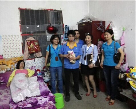 (工會主席陳凌芹攜噴涂車間副主任李毅、行政主管陳學碧、人資主管李慧英將善款送至周龍本人手中)
