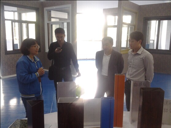 (陳主席在體驗中心為陳主任等老師一行介紹奮特色鋁單板、鋁模板)